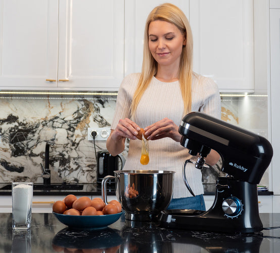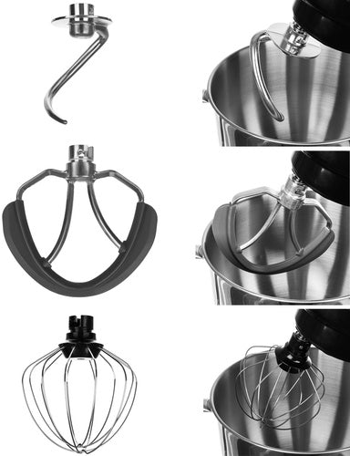 - 3 PATARIMAI – rinkinyje yra 3 patarimai ruošiant maistą. Maišytuvas su silikoninėmis guminėmis juostomis naudojamas puikiai sumaišyti tešlos ingredientus. Kablys buvo skirtas gerai minkyti tešlą, pvz. mielinę tešlą ir plaktuvą , kuriuo plakami lengvi ingredientai, pavyzdžiui, plakta grietinėlė arba kiaušinių baltymai.