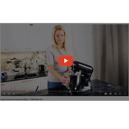 - SPECIFIKACIJA - spalva: juoda; dubenėlio talpa: 4,5l; greičio lygiai: 8 pavaros + PULSE; METAL GEAR SYSTEM pavara: planetinė, metalinė; valdymas: mechaninė rankenėlė su raudonu LED foniniu apšvietimu; užraktas, kad būtų išvengta atsitiktinio atidarymo; instrukcijos: Taip, lenkų kalba; galia: 1700 W; dažnis: 50-60 Hz; Medžiaga: ABS, 430 nerūdijantis plienas, aliuminio lydinys su teflonine danga, silikonas, PP, AS, PC su chromu, PS, PA, SUS304, EVA