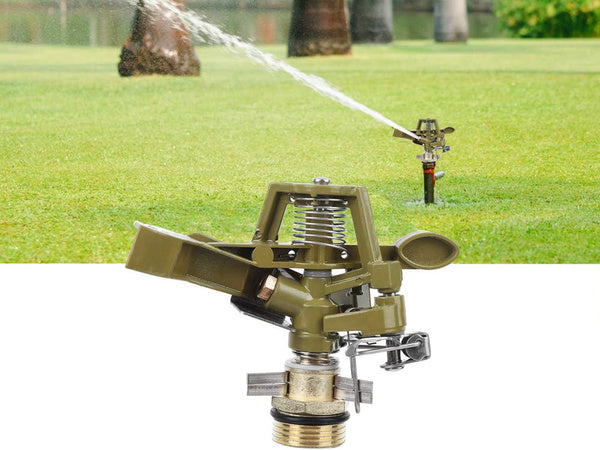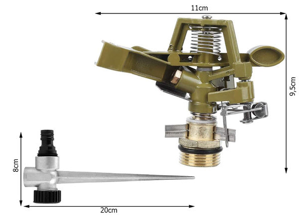 Pagamintas iš kokybiško metalo ir plastiko, 360° kampu besisukantis pulsuojantis metalinis vejos purkštuvą galite lengvai jungti su kitais purkštuvais. Jo matmenys yra 11 cm x 9,5 cm, todėl jis puikiai tinka bet kuriam sodui.