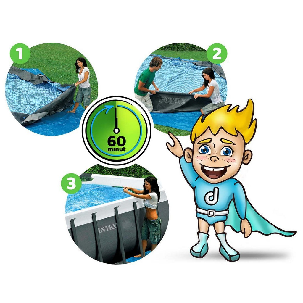 Šis baseinas ne tik suteikia pakankamai vietos šeimai ir draugams, bet ir yra lengvai montuojamas, reikalaujantis tik 60 minučių jūsų laiko. Su 18v1 komplektu, jūs turėsite viską, ko reikia, kad galėtumėte džiaugtis vandens pramogomis nuo pat pirmos dienos.
