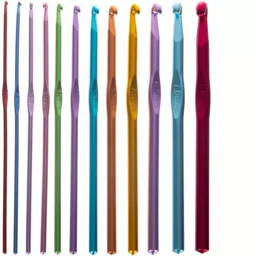 - 12 spalvingų nėrimo kabliukų: 2,0, 2,5, 3,0, 3,5, 4,0, 4,5, 5,0, 5,5, 6,0, 6,5, 7,0, 8,0 mm