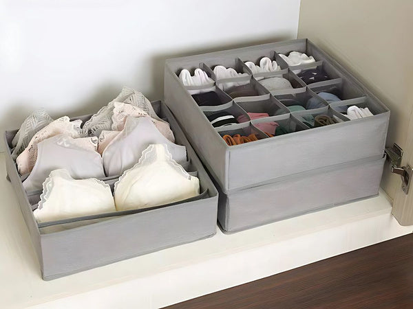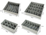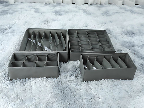 Apatinių drabužių organizatorius kojinių stalčių spintos dėžutė 4 dalių rinkinys - tai ideali priemonė, leidžianti palaikyti tvarką jūsų stalčiuose ir drabužių spintose. Su šiuo 4 pilkų organizatorių rinkiniu, jūsų apatinių drabužių, kojinių ir kitų priedų laikymas taps lengvas ir patogus.