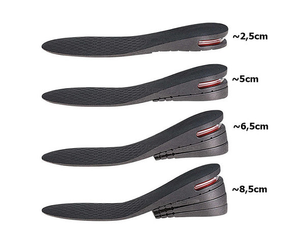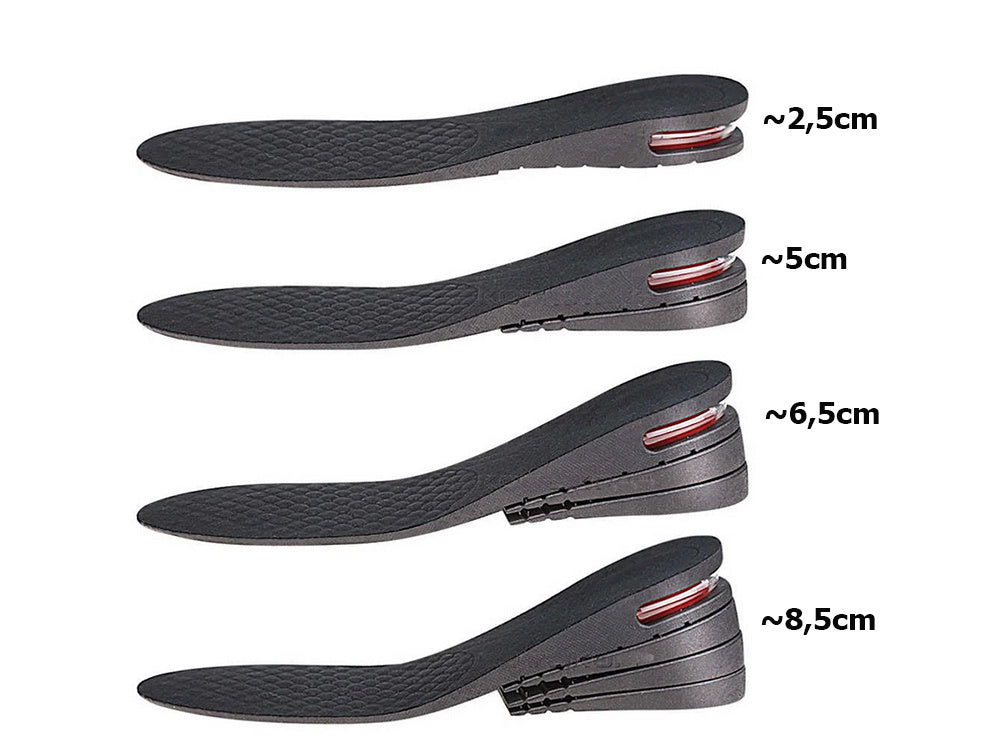 Dėlbatų vidpadžių komplekto mūsų ūgis pasikeis net keliais centimetrais. Pastebėsite ne tik ūgio skirtumą, bet ir naudojimo patogumą. Vidpadžiai pagaminti iš minkštos medžiagos, o oro pagalvėlė papildomai atpalaiduoja stuburą, kelius ir sąnarius. Su jais jausitės patogiai, kad ir kur eitumėte. Rinkinį sudaro viena pora viso pėdos ilgio vidpadžių ir 3 poros pagalvėlių. ✅ 1 vidpadis + 2,5 cm ✅ 2 vidpadžiai + 5 cm ✅ 3 vidpadžiai + 6,5 cm ✅ 4 vidpadžiai + 8,5 cm Avalynei su aukštu viršumi, pavyzdžiui: batams, aukštakulniams, sportbačiams, galite naudoti daugiau vidpadžių, nes tuomet pėda turi geresnę atramą ir stabilumą. Žemiems batams, pavyzdžiui: sportbačiams, šlepetėms, mokasinams, naudokite mažiau vidpadžių, kad pėda būtų stabili ir nebūtų linkusi suktis. ✅ Produkto kodas: ✅ 27151 ✅ Paminkštinimas ✅ Pralaidus orui ✅ Galima sumažinti iki mažesnio dydžio ✅ Dydis: universalus nuo 35 iki 42 ✅ Ilgis: 27 cm ✅ Plotis: 8 cm ☑️ Gamykliniai nauji batų vidpadžiai, didinantys aukštį