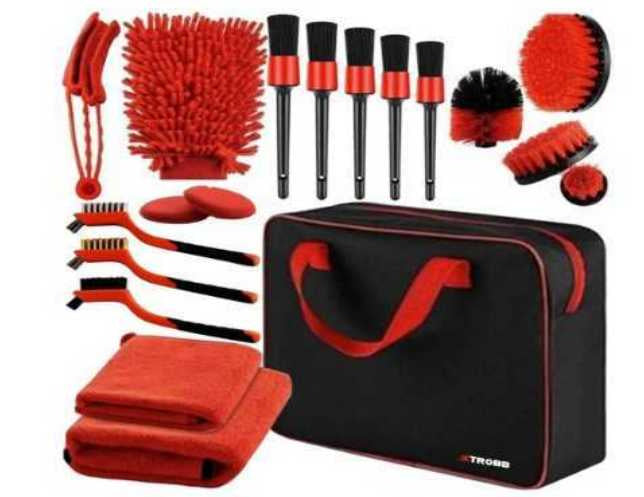 Išsamus 19 dalių valymo rinkinys automobiliui: šluostės, šepečiai, purkštuvai ir kitos priemonės. Tinka vidaus ir išorės priežiūrai. Puikus pasirinkimas automobilio švarai palaikyti.