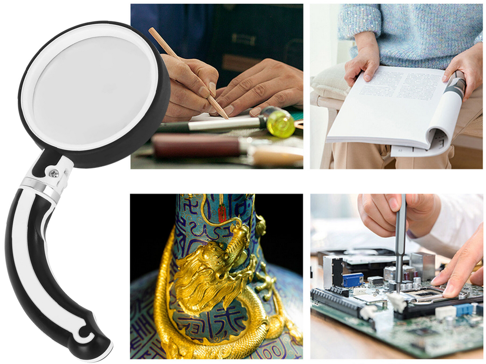 - Ergonomiška rankena: Pasukama ir sulankstoma, leidžia lengvai ir patogiai naudotis lupa.