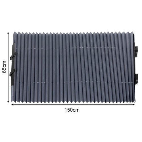 - SPECIFIKACIJA – spalva: juoda, pilka; medžiaga: poliesteris + aliuminio folija; tvirtinimo kronšteinas: aliuminis + ABS + PVC; dydis: universalus; matmenys: 150 x 65 cm; svoris: 0,23 kg; svoris pakuotėje: 0,43 kg.