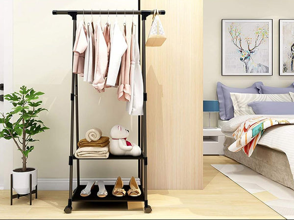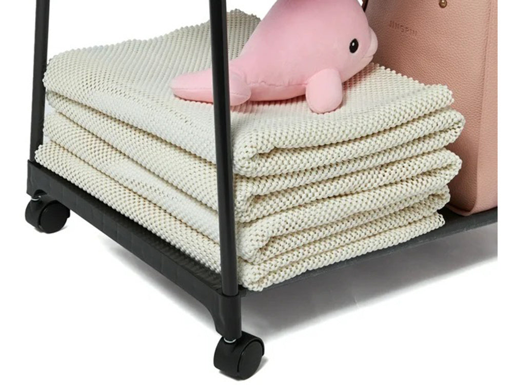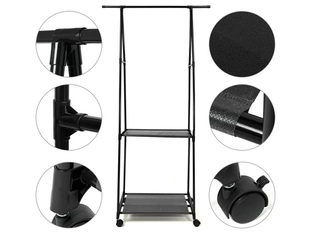 Pristatome drabužių pakabą drabužių stovą, kuris taps puikiu jūsų namų organizavimo sprendimu. Šis modernus drabužių stovas su dviem lentynomis ne tik padeda laikyti drabužius, bet ir suteikia stilingą akcentą bet kuriam interjerui.