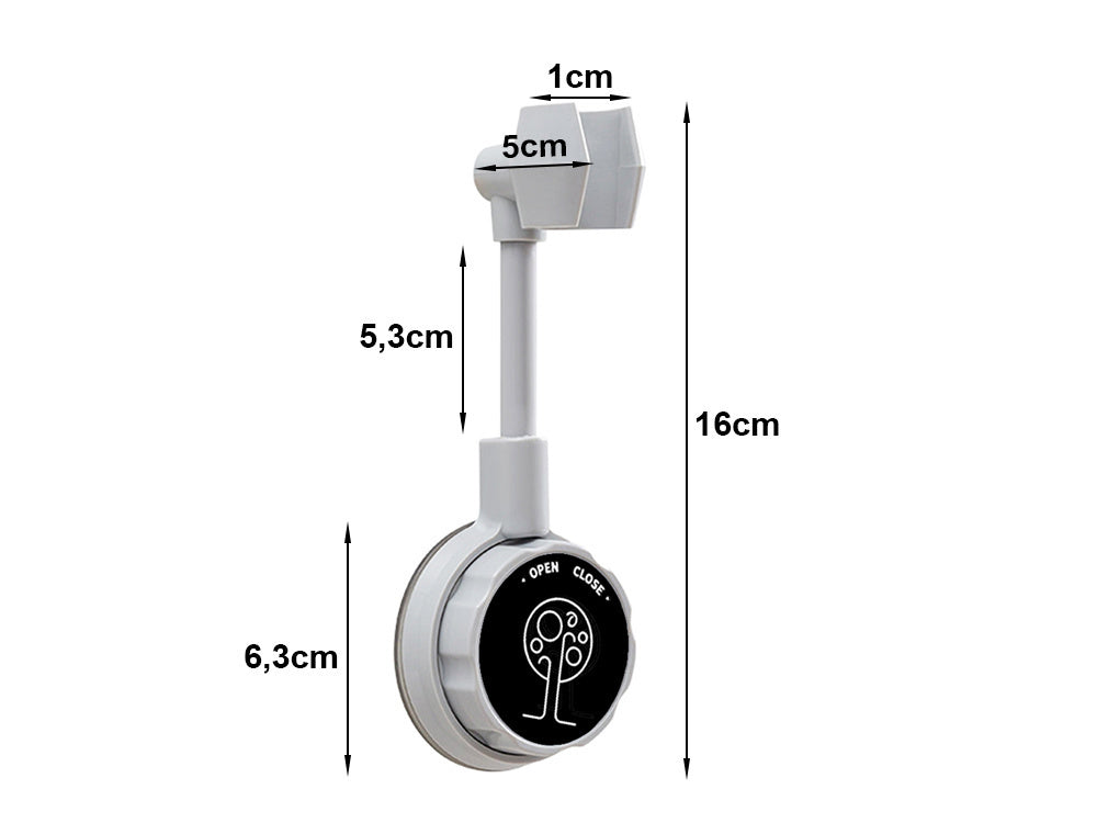 Laikiklis yra pagamintas iš tvirto plastiko ir turi stiprų, 16 cm skersmens siurbtuką, užtikrinantį stabilumą ir ilgaamžiškumą. Suktuko skersmuo yra 6,3 cm, o jo gylis – 5 cm, todėl jis puikiai tinka įvairių tipų dušo rankenoms.