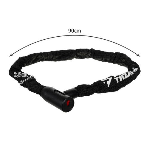 - GRANDINĖ - Dviračio užraktas su grandinės klostėmis su 15 6 mm apvalaus skerspjūvio jungtimis , kurios padidina atsparumą įpjovimams ir smūgiams. Kiekviena ląstelė yra kruopščiai sukurta, kad atlaikytų sudėtingiausias naudojimo sąlygas. Dviračio užraktas pagamintas iš nerūdijančio plieno 90cm ilgio vandeniui atspariame tekstiliniame dangtelyje.