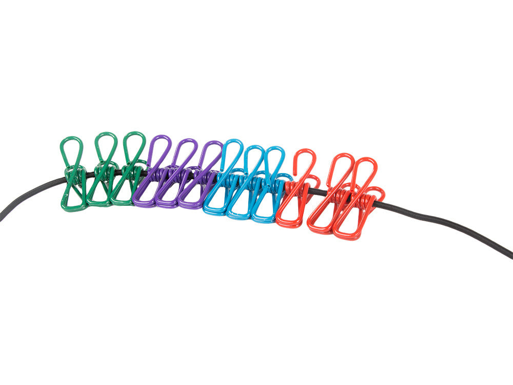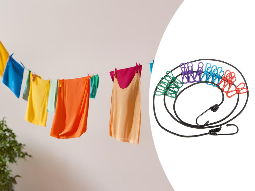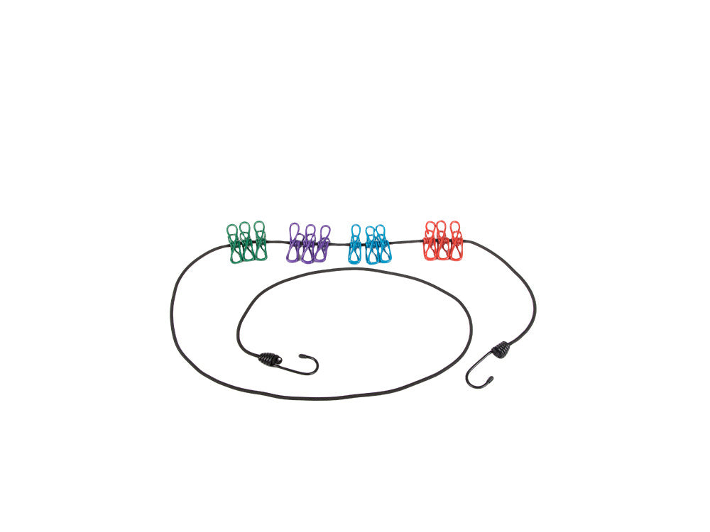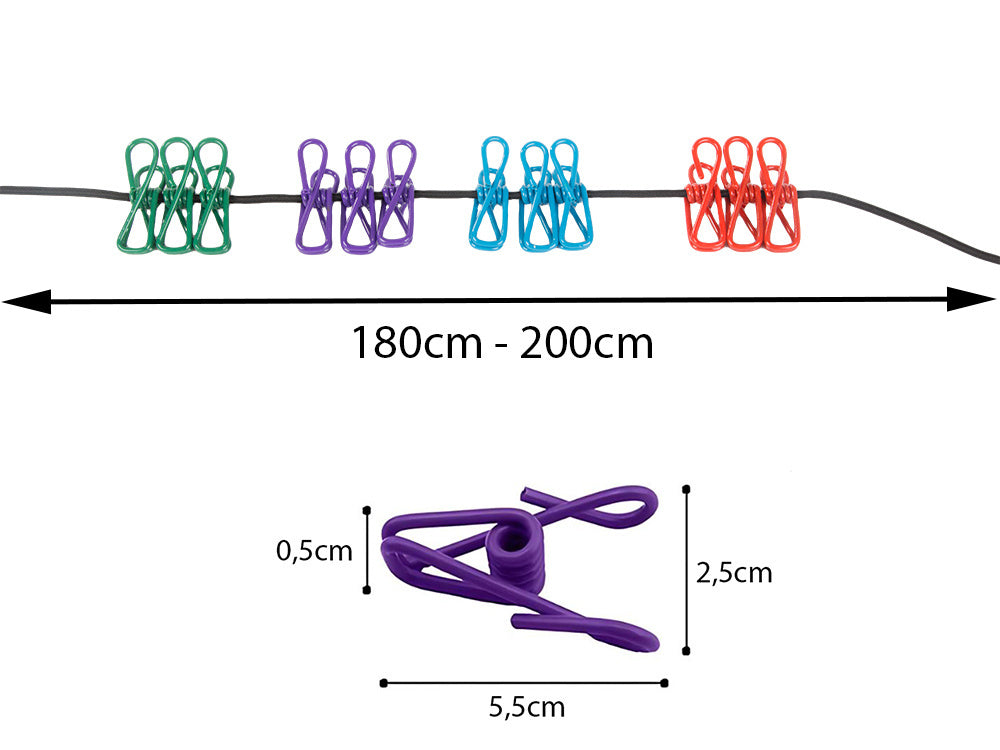 Elastinė skalbinių linija su 12 spaustukų yra puikus sprendimas tiek namams, tiek kelionėms. Ši praktiška ir patvari virvė yra pagaminta iš lanksčių medžiagų, todėl puikiai atlaiko bet kokias oro sąlygas. Jos reguliuojamas ilgis ir ištempimas leidžia ją pakabinti bet kur - nuo stovyklavietės iki balkono ar vonios kambario.