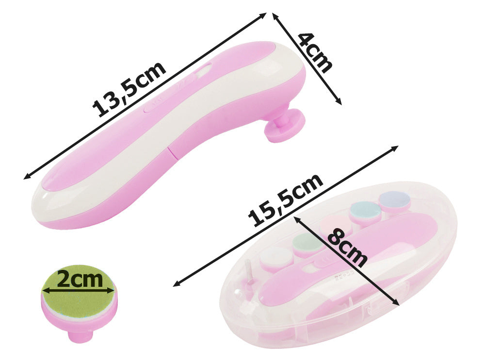 Elektrinis na il kirptuvas kūdikiams sukurtas atsižvelgiant į švelnius kūdikių nagus. Kirptuvo ašmenys yra tinkamai užaštrinti, kad nekiltų pavojus nukirpti ar subraižyti kūdikio odą. Nagų kirptuve yra kintamo greičio reguliatorius , todėl jį lengva naudoti. Kirptuvė turi gerą apšvietimą, kuris padeda tiksliai nukirpti nagus. Kiekvieną judesį atlikite atsargiai, kad išvengtumėte atsitiktinių pažeidimų. Prietaisą patogu naudoti, jis lengvas, todėl jį lengva laikyti rankoje kirpant nagus. ✅ Rausvas antgalis kūdikiams nuo 0 iki 3 mėnesių ✅ Žalias antgalis, skirtas 4-11 mėnesių vaikams ✅ tamsiai žalias antgalis vyresniems nei 12 mėnesių vaikams ✅ Vilnonis poliravimo padas suaugusiesiems ✅ Metalinis padas su pagalvėle tvirtam pjovimui ✅ Stulpelio dangtelis nago kraštui nubrėžti ✅ Produkto kodas: ✅ 24404_R ✅ Lengvas ir patogus ✅ Pašalina lako likučius ✅ Nuvalo nagus ✅ Greitas antgalių keitimas ✅ S et kirptuvų ✅ 6 šlifavimopagalvėlės ✅ Maitinimo šaltinis: 2 x AA akumuliatorius ✅ CE sertifikatas ✅ Spalva: rožinė ☑️ Gamyklinis naujas nagų pjaustytuvas ☑️ 6 skirtingi pjaustytuvai ☑️ dėklas ☑️ Originali pakuotė