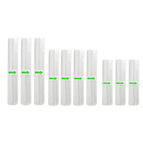 - KOMPAKTIŠKI DYDŽIAI - Dėl mažo dydžio suvirintuvą lengva nešiotis ir neužima daug vietos. Nenaudotas Prietaisas gali lengvai tilpti į namų spintą ar daiktadėžę . Rinkinyje net 9 rulonai sandarinimo folijos ir 5 didesni maisto maišeliai dešimto ritinio pavidalu . Jie yra įvairių dydžių ir storių, kuriuos galima pritaikyti prie pakuojamo maisto.