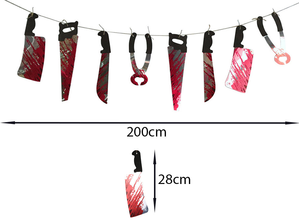 Pagaminta iš patvarios ir netoksiškos medžiagos, ši girlianda yra ideali tiek vidaus, tiek išorės naudojimui. Jos ilgio pakanka, kad ji taptų pagrindiniu dekoracijos akcentu, o tikroviškai atrodantys peiliai, pjūklai ir kapoklės, atrodo tarsi aplaistyti šviežiu krauju, kas dar labiau sustiprina šiurpų įspūdį.