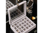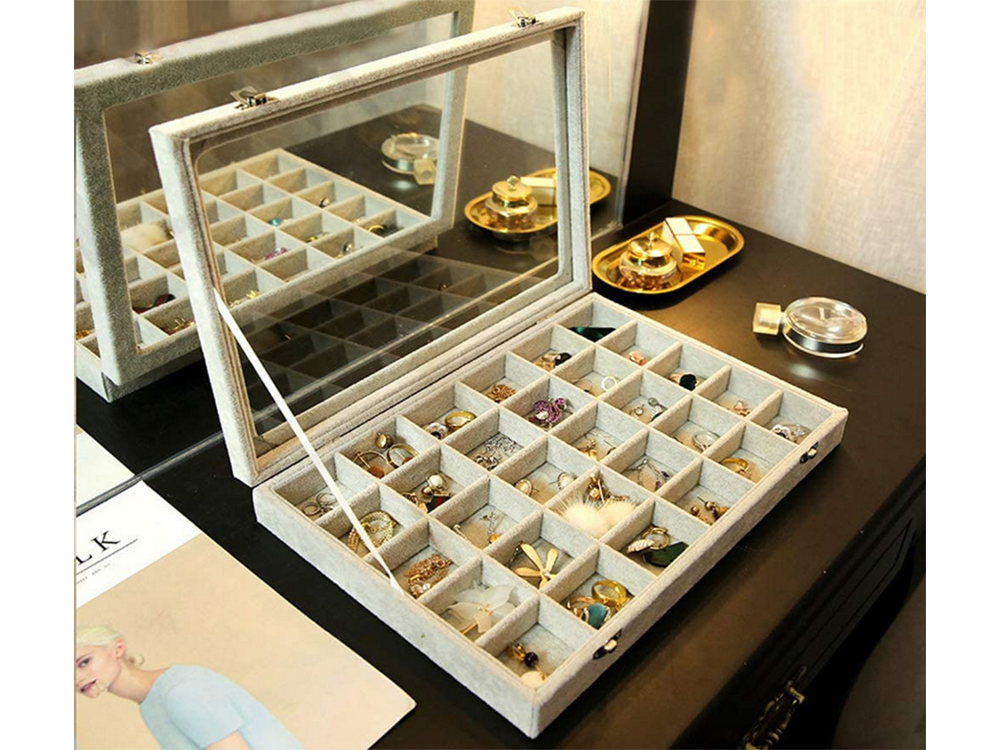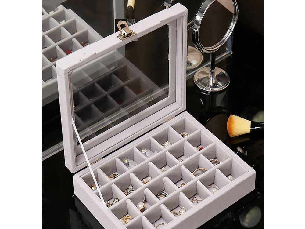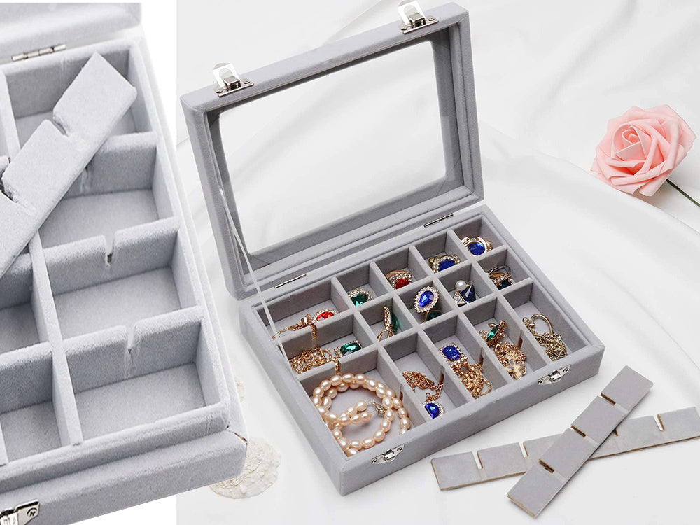 Pažinkite mūsų juvelyrinių dirbinių dėžutės organizatorių, rodančią zomšą – idealią vietą, kur galite saugiai ir stilingai laikyti savo papuošalus. Ši talpi dėžutė turi 24 skyrius, kurie puikiai tinka žiedams, grandinėms, auskarams, apyrankėms ir kitiems aksesuarams.