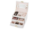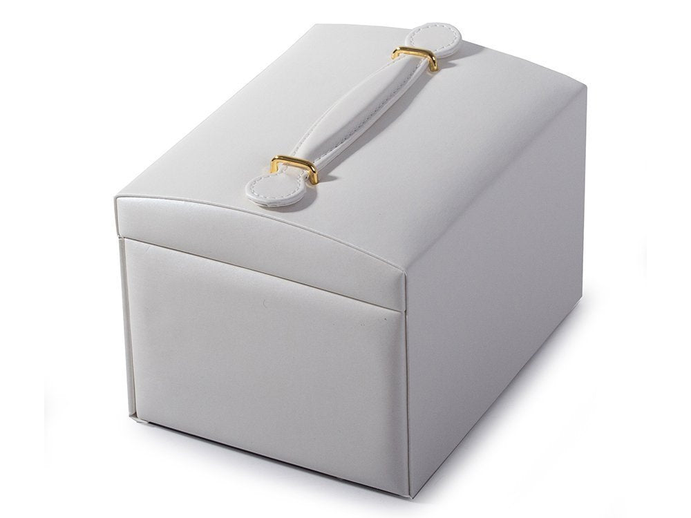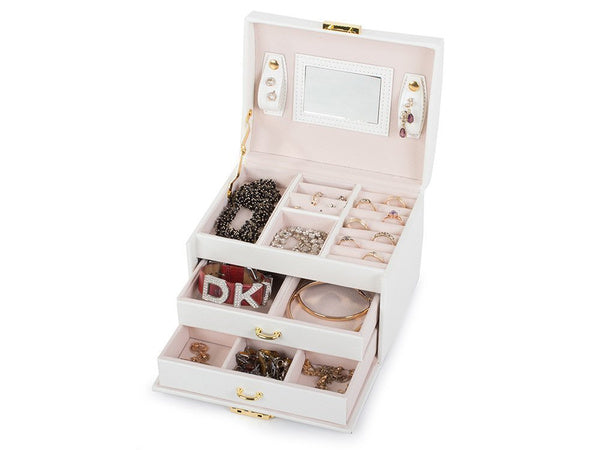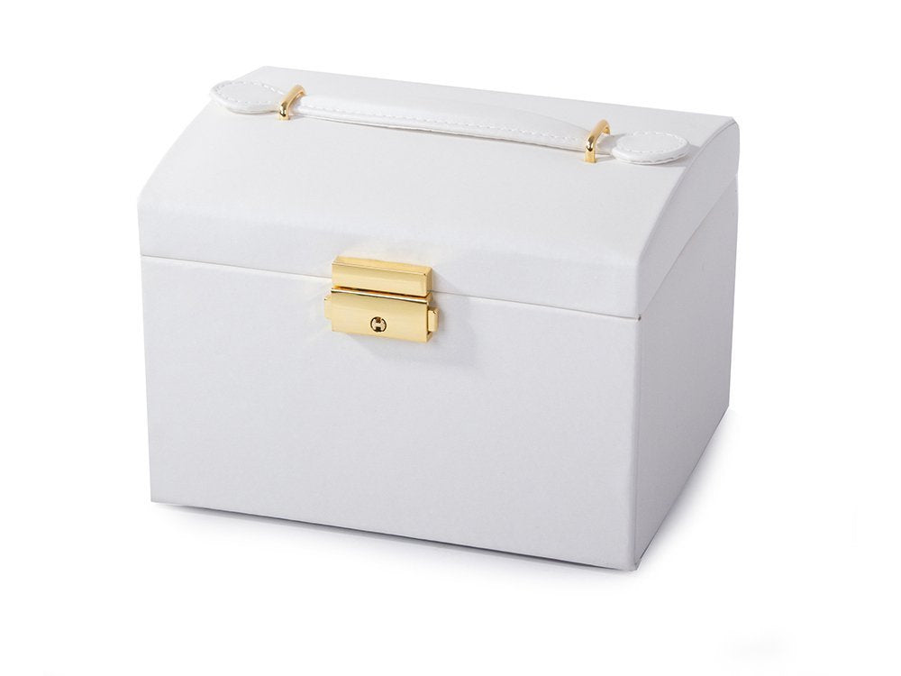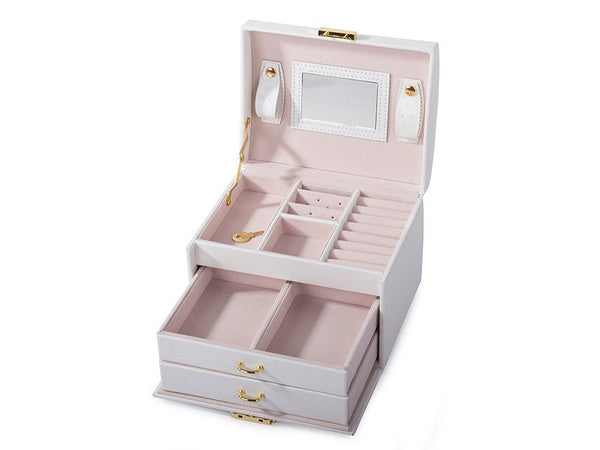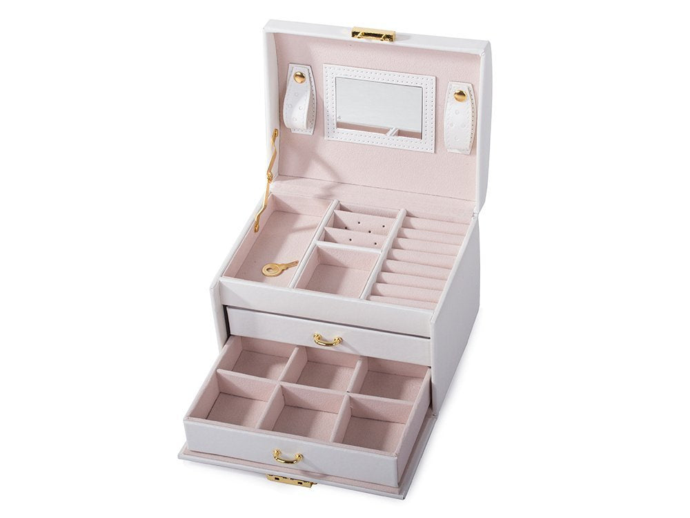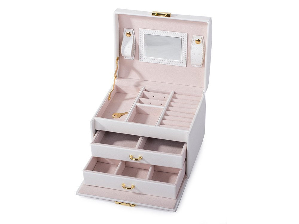 - Funkcionalumas: Su viršutiniu dangteliu, pakabų auskarams, veidrodėliu ir erdviais stalčiais didesniems papuošalams, tokiais kaip laikrodžiai.