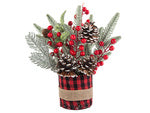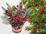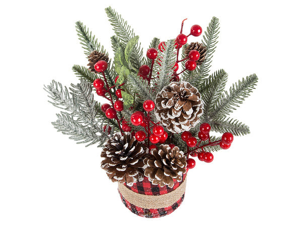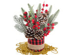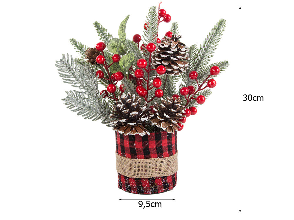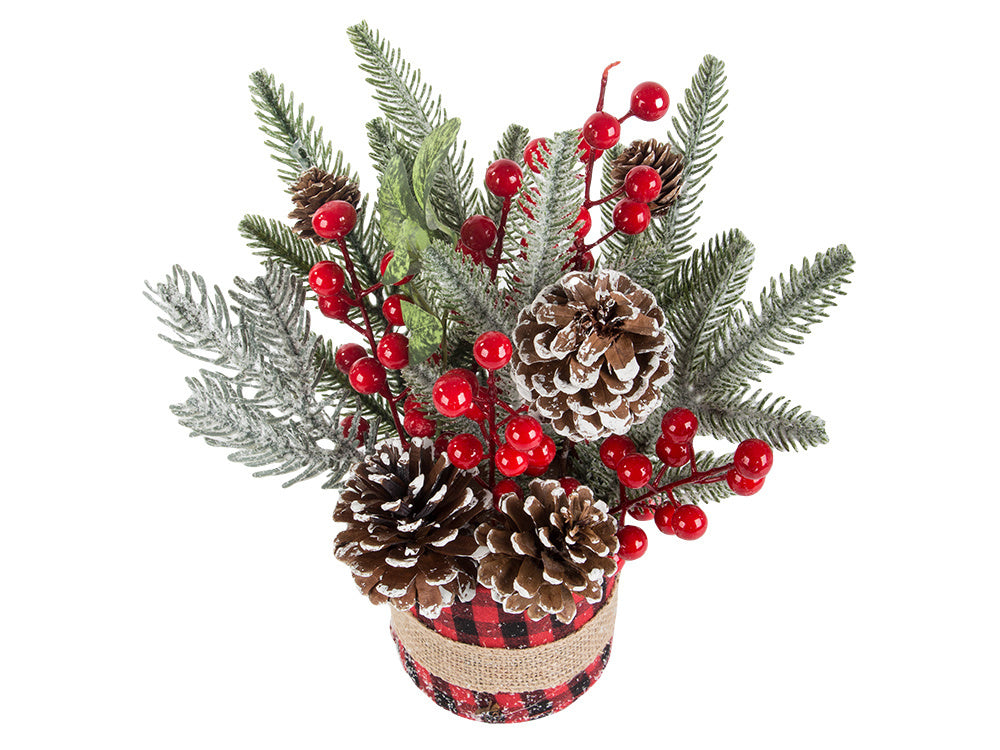 - Raudonos uogos ir natūralūs pušų kankorėžiai suteikia spalvų ir elegancijos.