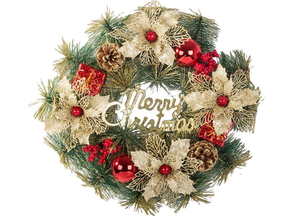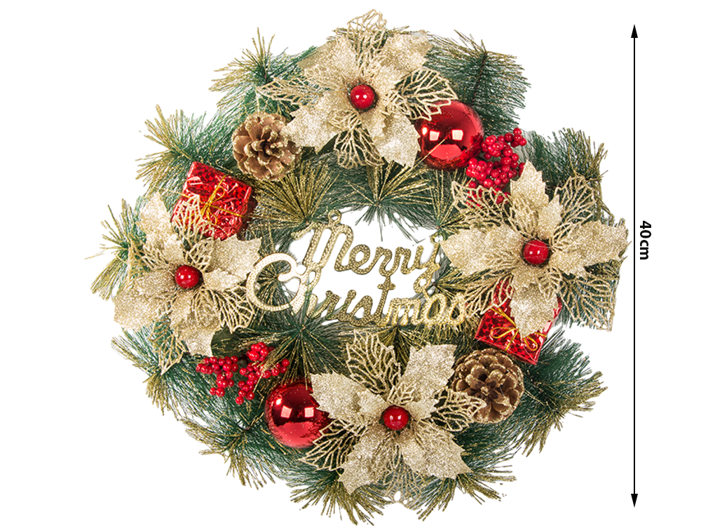 Vainikas pagamintas iš aukštos kokybės dirbtinių pušų šakų, natūralių pušų kankorėžių, puošmenų ir dovanų, o taip pat puikuojasi dideliu „Merry Christmas“ užrašu. Tradicinės kalėdinės spalvos daro jį labai patraukliu ir sodriu.