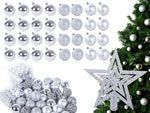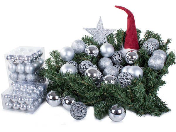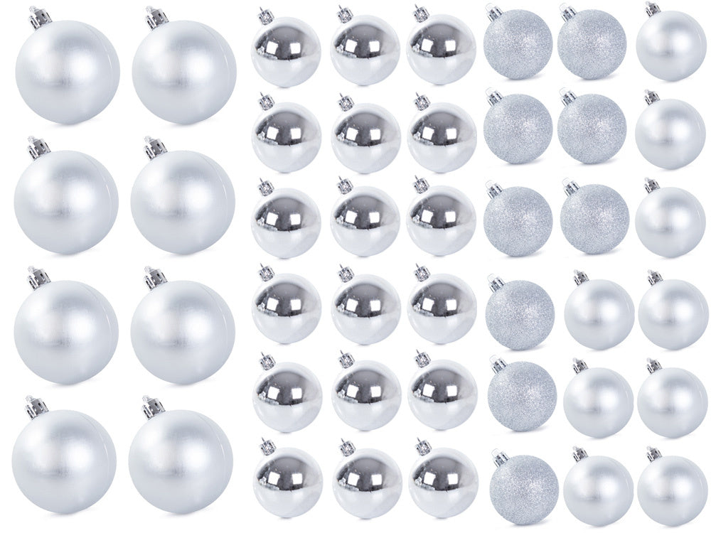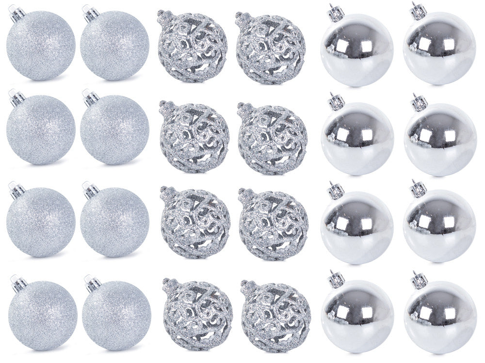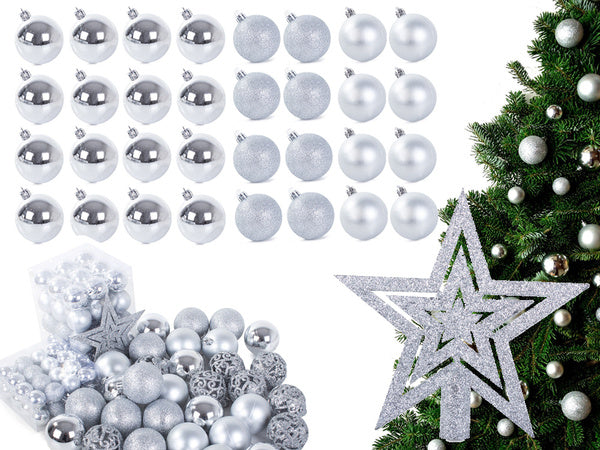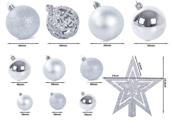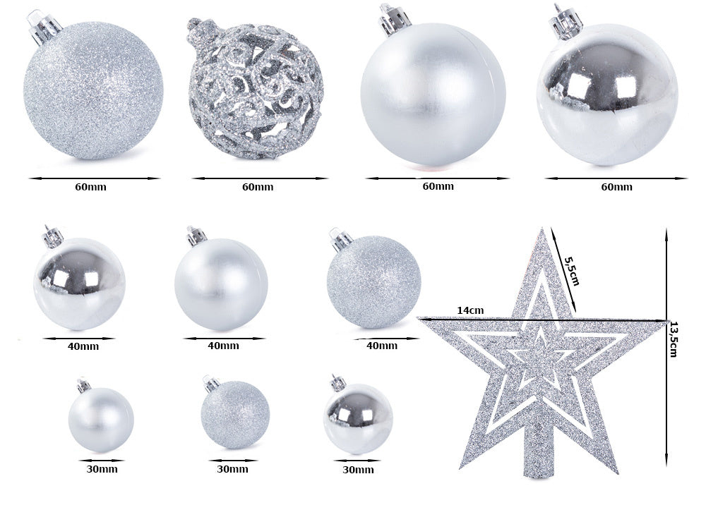 Rinkinyje yra įvairių dizainų ir dydžių, todėl galite lengvai kurti unikalius ir meniškus derinius. Sidabrinės spalvos papuošalai atspindi šviesą ir suteikia jūsų eglutei elegancijos.