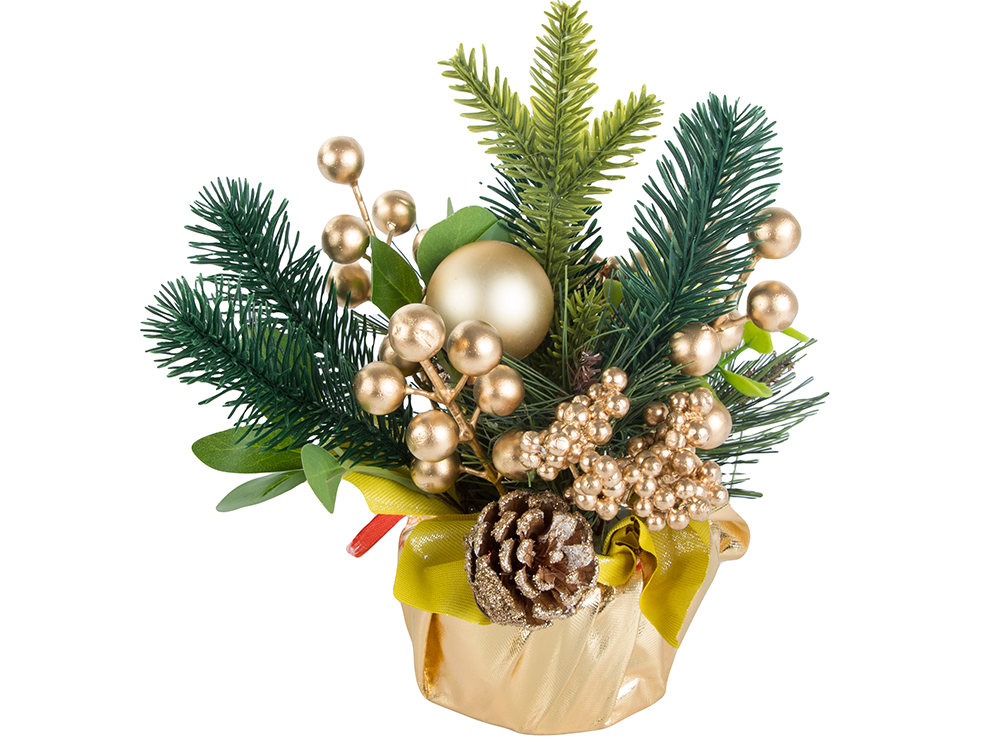 Ši puošmena yra įrengta ant stabilios, auksinės spalvos bazės, kuri suteikia elegantišką ir stilingą išvaizdą. Papuošimas sukurtas iš natūralių pušų kankorėžių ir blizgaus aukso akcento, kurie atspindi šviesą ir sukuria nuostabų spalvų žaismą.
