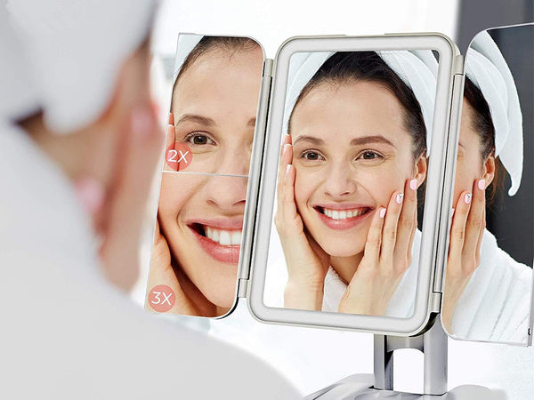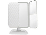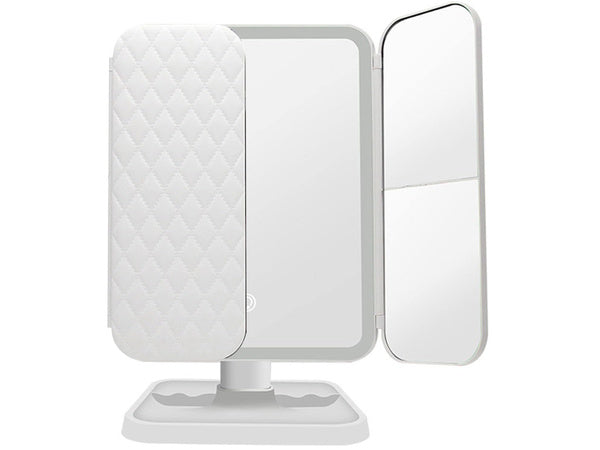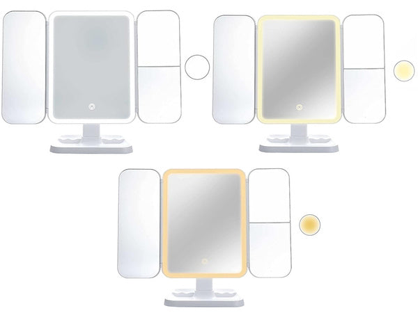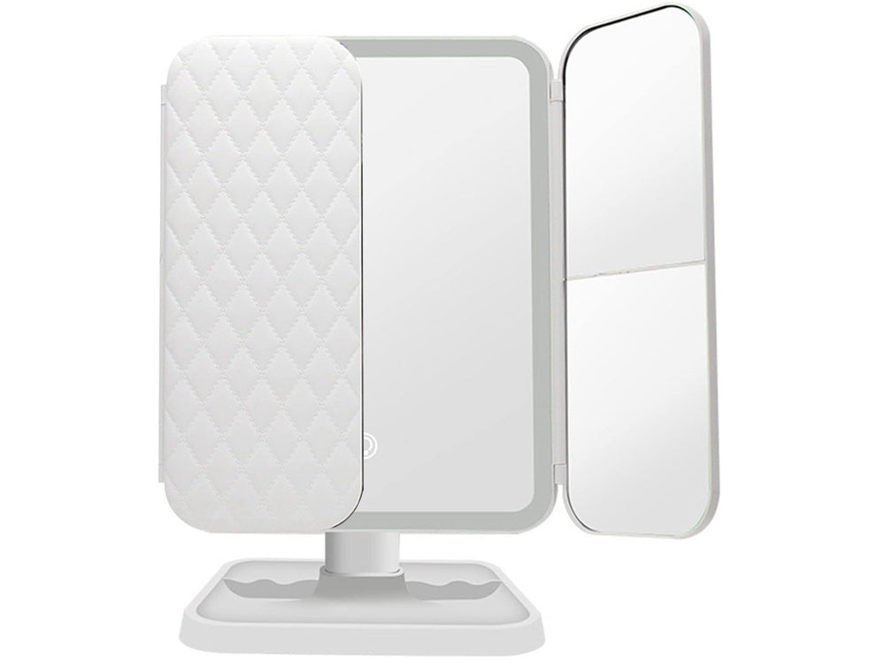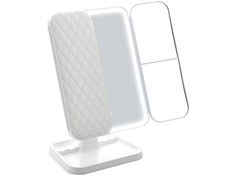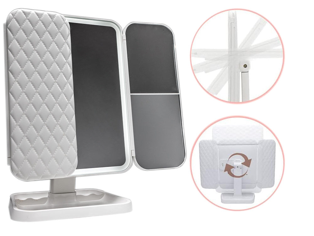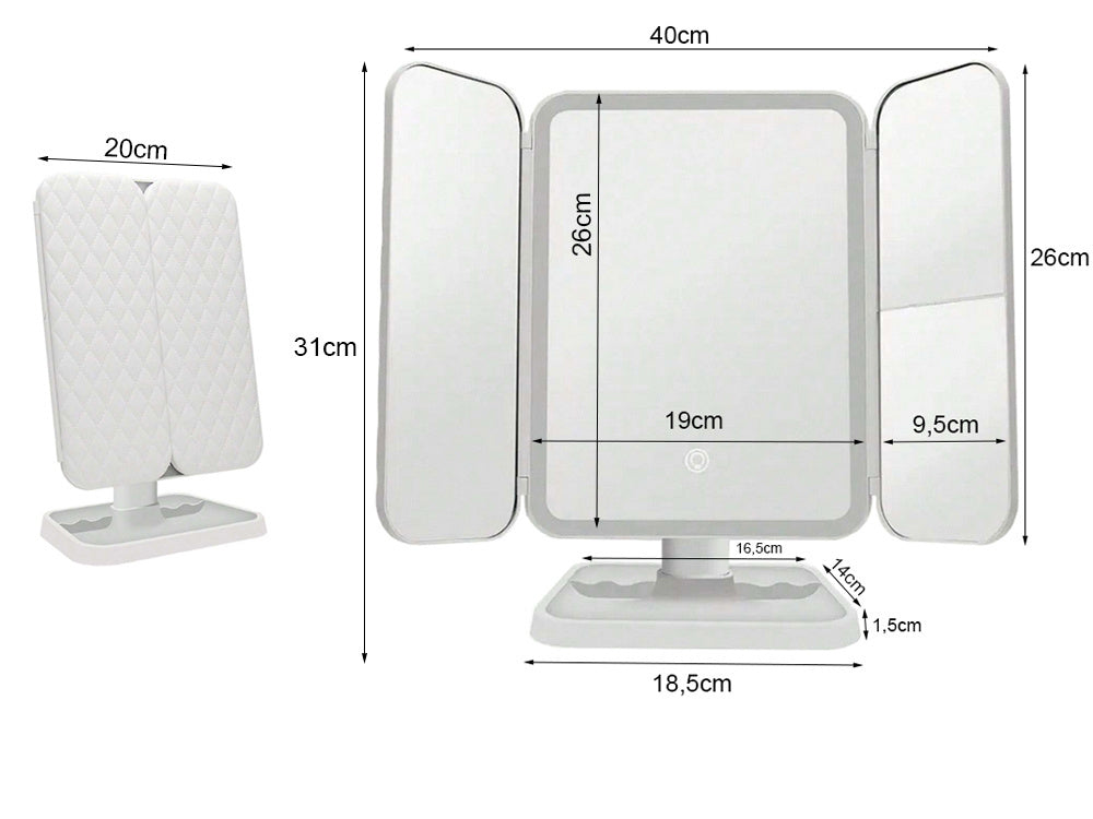Šviečiantis veidrodis yra labai praktiškas ir itin naudingas prietaisas, skirtas grožio procedūroms, makiažui atlikti ar kontaktiniams lęšiams įsidėti. Jame įmontuotas LED apšvietimas, valdomas veidrodžio korpuse įmontuotu jutikliniu jungikliu. Prietaisas turi šaltą, šiltą ir neutralios spalvos šviesą , kurią galite rinktis pagal savo poreikius. Apšvietimą taip pat galima pašviesinti ir pritemdyti . Veidrodį maitina įmontuota įkraunama baterija, o įkraunamas jis per pridedamą USB laidą. Jis turi papildomus veidrodėlius šonuose. Vienas šoninis veidrodis su natūraliu atspindžiu ir du didinamieji veidrodžiai 2 X, 3 X ✅ Produkto kodas: ✅ 27029 Aukštos kokybės konstrukcija ✅ Turi įmontuotą LED apšvietimą Pasirenkamas foninis apšvietimas: šaltai baltas, šiltai baltas, neutralus Jutiklinis apšvietimo jungiklis ant veidrodžio Maitinimas: įmontuota įkraunama baterija Įkrovimas per USB laidą, įkrovus veidrodis veikia be laido. USB laido ilgis: ~75 cm Turi papildomą veidrodėlį šone Spalva: balta CE sertifikatas ✅ Sulankstytas veidrodis: 31 cm x 20 cm Nesulankstytas veidrodis: 40 cm x 31 cm ✅ Didelis veidrodis: 19 cm x 26 cm Papildomas šoninis veidrodis: 9,5 cm x 26 cm ✅ Bendras aukštis: 35 cm Stovo matmenys: 18,5 cm x 14 cm x 1,5 cm x 16,5 cm