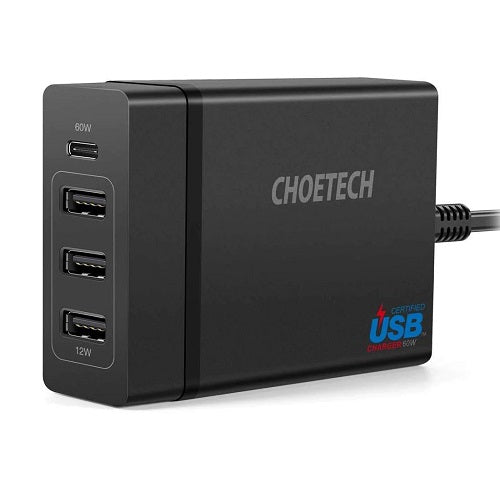 Tinklo kroviklis Choetech su trimis USB Type-A jungtimis ir viena USB Type-C PD 60W jungtimi. Su 1.5m ilgio laidu.