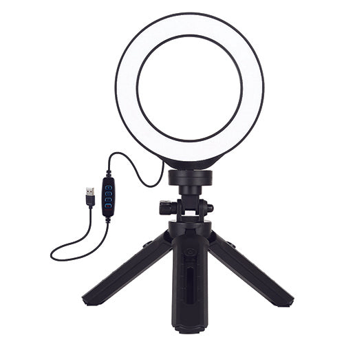 LED žiedinė lempa, 12 cm skersmens, su trikoju nešiojamu stovu, reguliuojamu iki 14.5 cm aukščio.