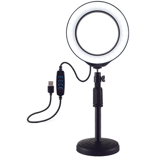 LED žiedinė lempa 16 cm (6.2 colio) skersmens su reguliuojamu stovu 18-28 cm ir USB jungtimi.