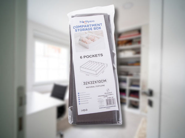 Įsigykite mūsų liemenėlių organizatorių, kuris yra idealus sprendimas visiems, siekiantiems palaikyti tvarką savo drabužinėje. Šis praktinis organizatorius, turintis 6 skyrius ir matmenis 32x32x10 cm, puikiai tinka liemenėlėms, apatiniam trikotažui ir kitiems smulkiems daiktams saugoti.