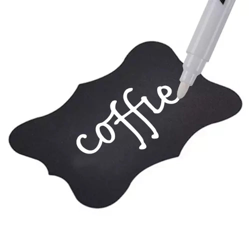 - ĮSKAIČIUOTI BALTI RAŠIKLIAI – komplekte yra baltas žymeklis, kurio dėka užrašas ant lipduko bus matomas iš toli.