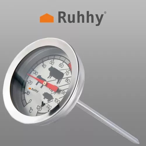 Puikus analoginis termometras, skirtas ne tik rūkykloms – jis turi platų gastronomijos pritaikymą tiek namuose, tiek restoranuose, tiek maisto pramonėje. Nesunkiai patikrinsite rūkytos mėsos (ar kito patiekalo) temperatūrą, užtikrindami puikią jos kokybę. Termometras pagamintas iš nerūdijančio plieno. Jame yra labai praktiški simboliai, nurodantys optimalią tam tikros rūšies mėsos rūkymo temperatūrą. Komplekte yra dangtelis zondui laikyti, kurį galima naudoti ir laikyti - turi praktišką "klipsą" kaip rašiklis.