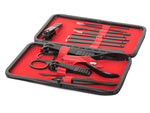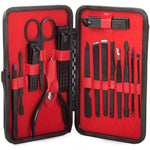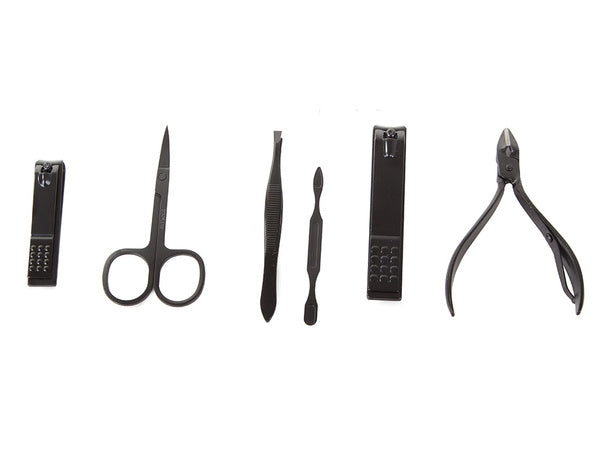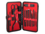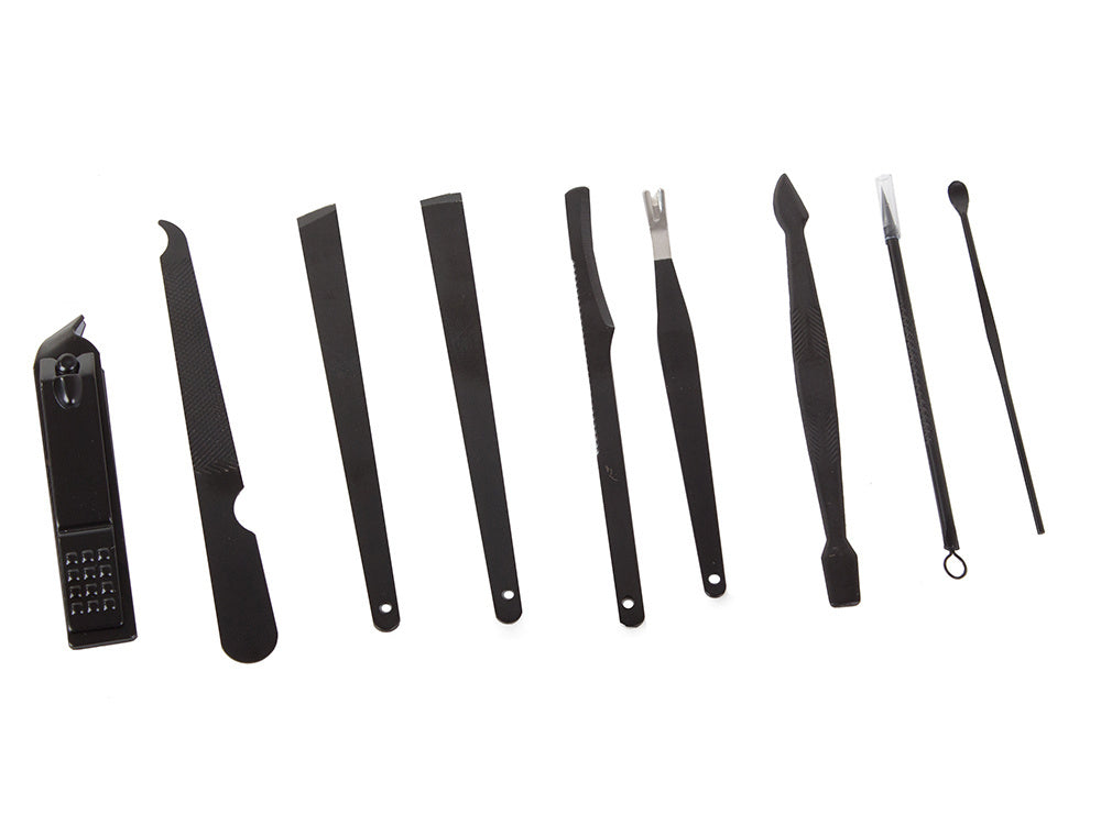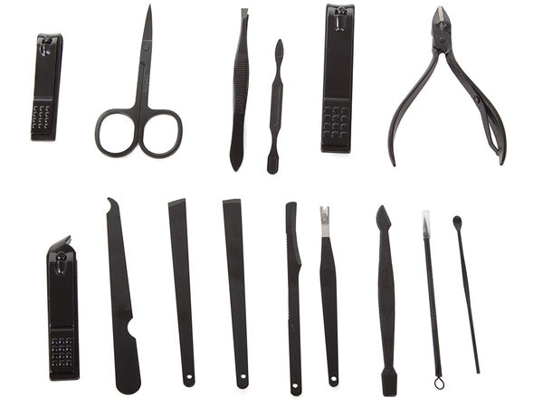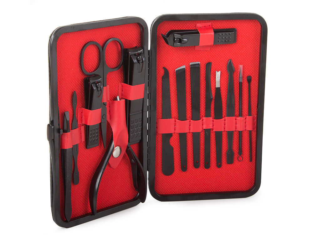 Kiekvienas įrankis turi savo vietą elegantiškame juodame dėkle su raudonu pamušalu, užtikrinančiame tiek stilingą išvaizdą, tiek patogumą. Dėklas yra kompaktiškas ir lengvai telpa rankinėje, kuprinėje ar kelioninėje kosmetinėje.
