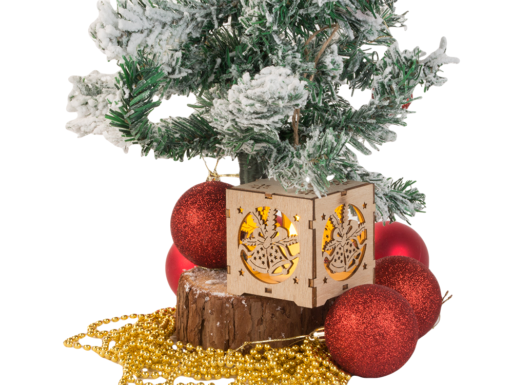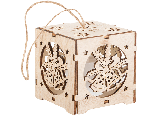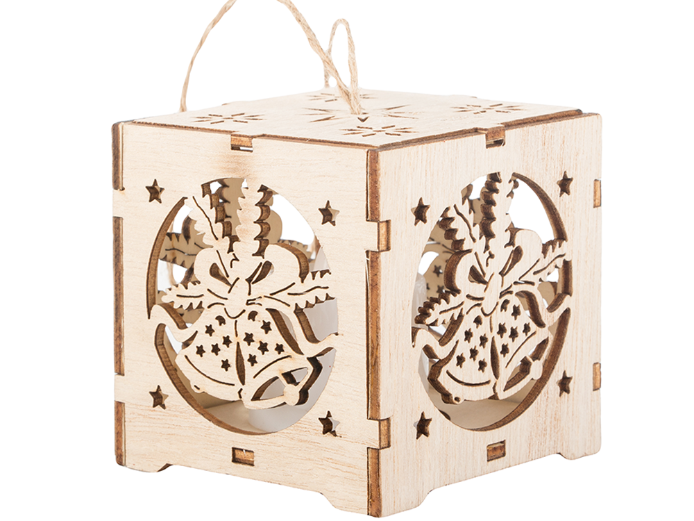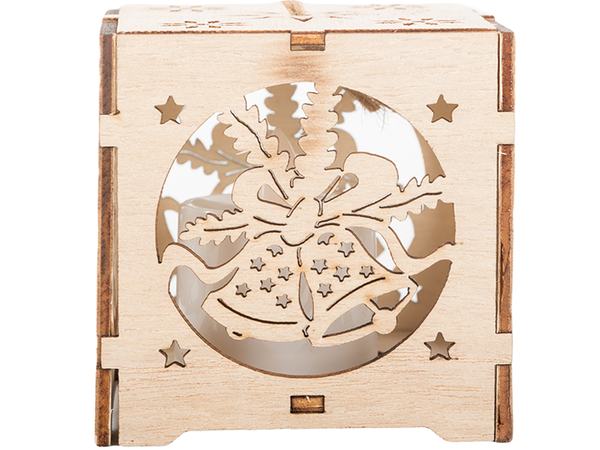 Žibintas pagamintas iš natūralaus medžio, puošiamas subtiliais žvaigždžių ir kalėdinių varpelių motyvais, suteikiančiais jam ypatingą žavesį. Jo šiltas apšvietimas kuria jaukią atmosferą, idealiai tinkančią šventiniam laikotarpiui.