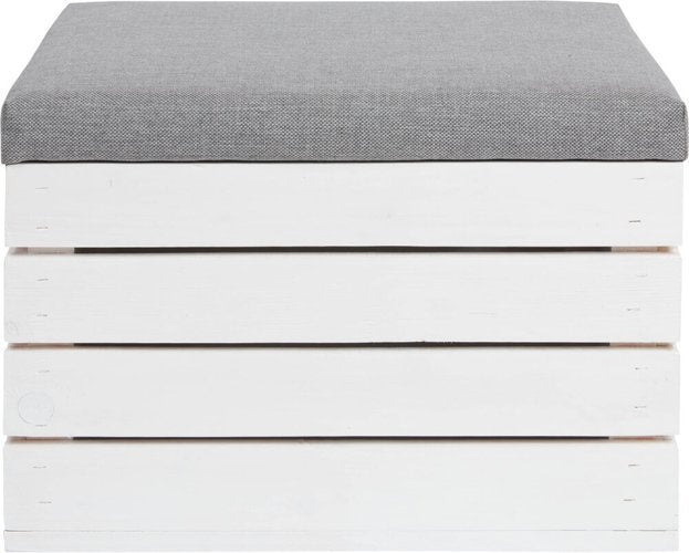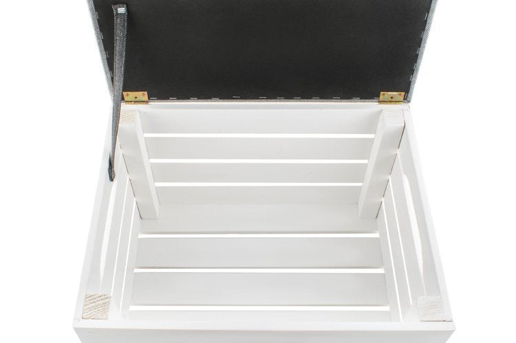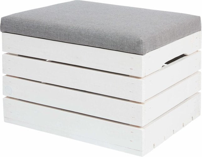 SPECIFIKACIJA – medžiaga: eglės mediena + putplastis; apmušalų spalva: pilka; lentjuosčių spalva: balta; maksimali apkrova: 150 kg; dėžutės matmenys (ilgis/plotis/aukštis): 40/50/35cm; dėžutės svoris: 6,3 kg; svoris su pakuote: 7kg.