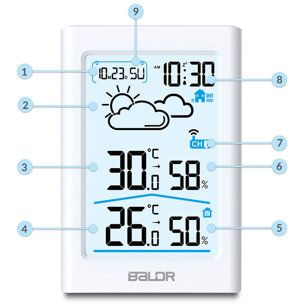 Išmanioji Berdsen BD-911 meteorologinė stotis su baltu foniniu ekranu. Matuoja temperatūrą, drėgmę, atmosferos slėgį. Tinka tiek vidaus, tiek lauko sąlygoms.