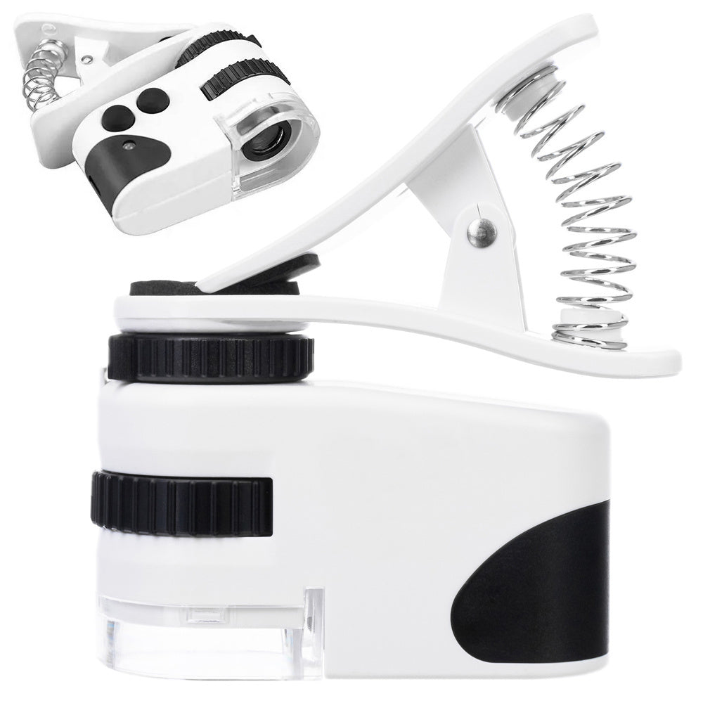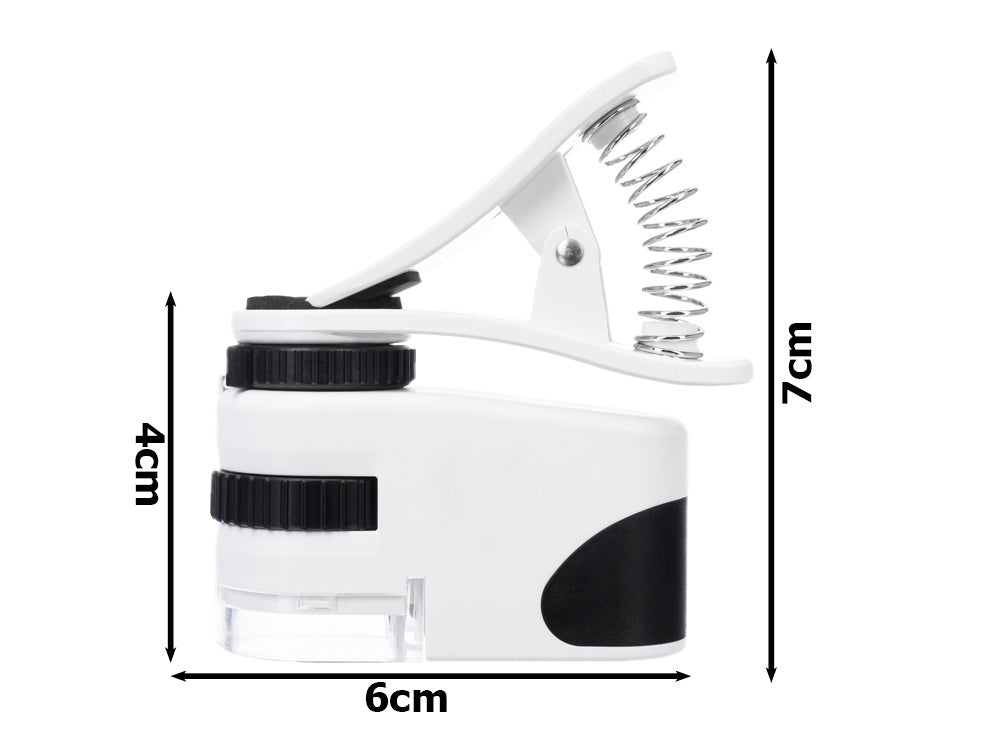 Naudojimas paprastas: tiesiog pritvirtinkite mikroskopą prie telefono ir paspauskite du mygtukus šone, kad valdytumėte apšvietimą. Dėka nuimamo telefono laikiklio, jį lengvai pritaikysite bet kuriam telefonui.