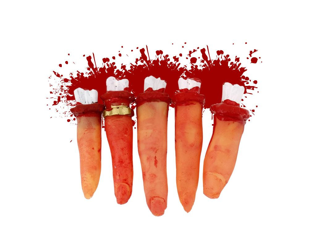 Guminiai pirštai atrodo tikroviškai, imituojantys nupjautus ir kruvinus galiukus. Pagaminti iš lanksčios, netoksiškos gumos, jie yra saugūs naudoti ir idealiai tinka: