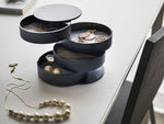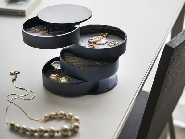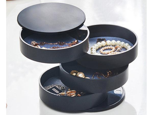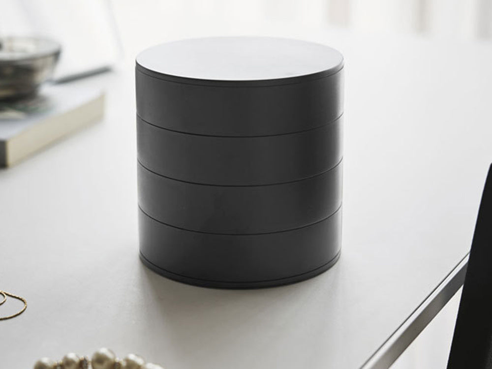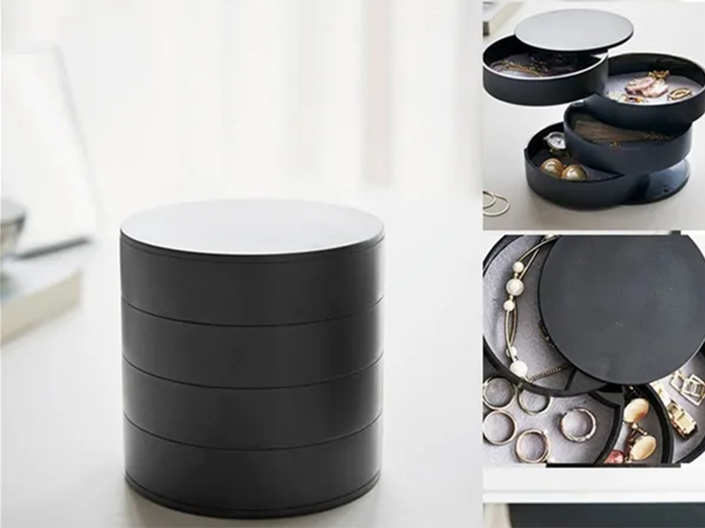 Atraskite eleganciją ir tvarką su Papuošalų dėžutės organizatoriaus apvalia ištraukiama dėžute, puikiai tinkančia jūsų smulkmenoms! Ši juoda dėžutė ne tik atrodo stilingai, bet ir yra labai funkcionali. Su 4 skyriais, ji idealiai tinka jūsų papuošalams, kosmetikai, siuvimo reikmenims ir kitiems mažiems daiktams laikyti.