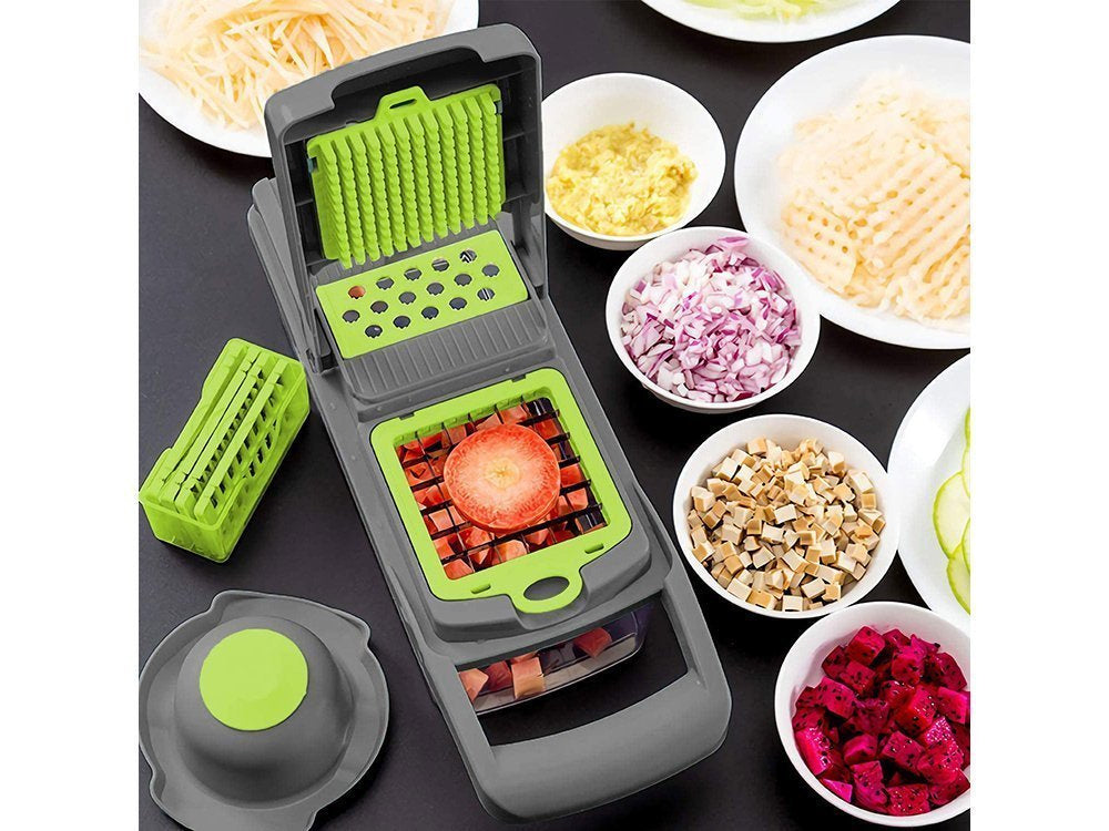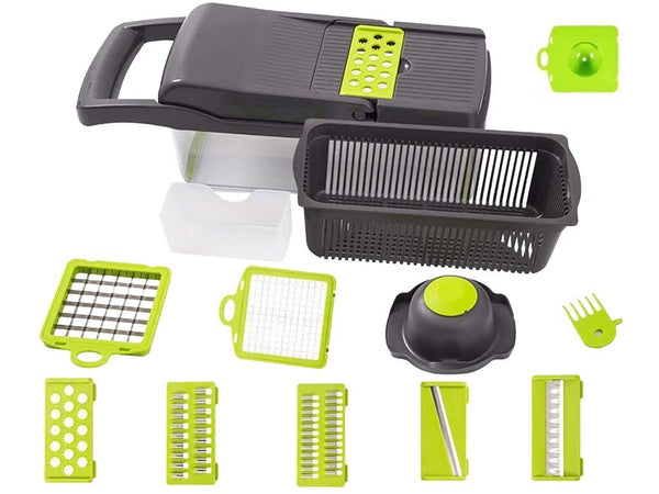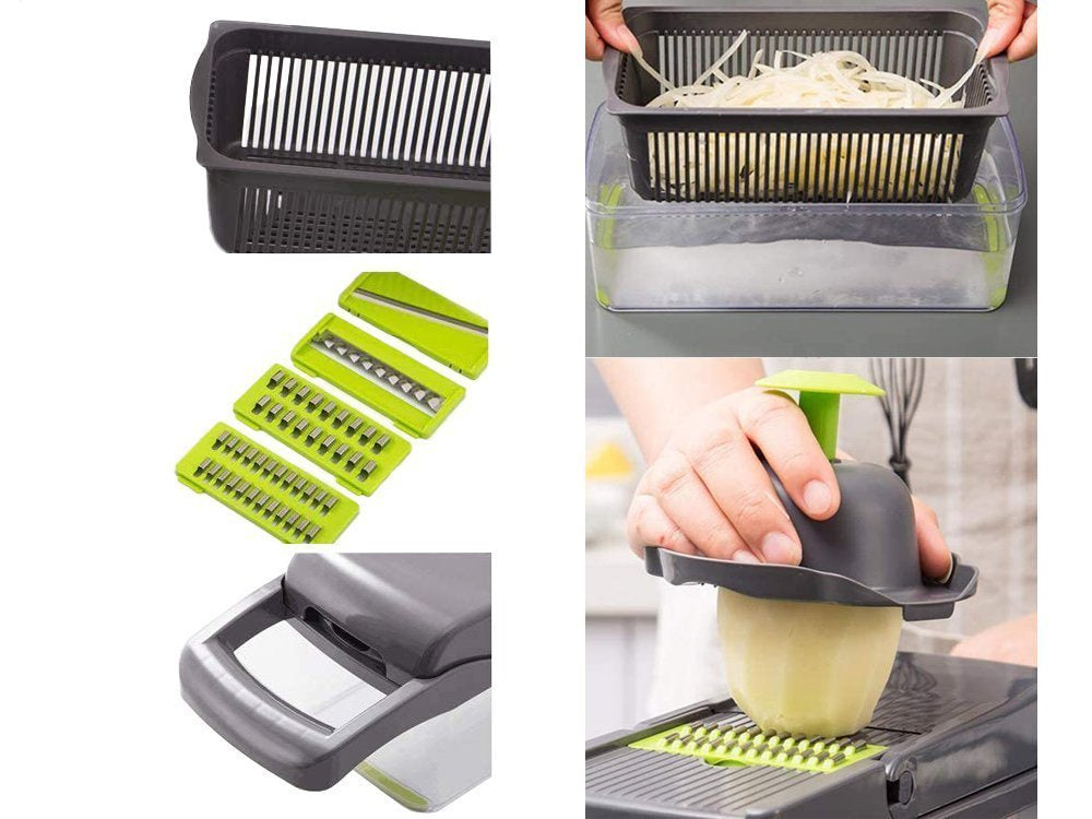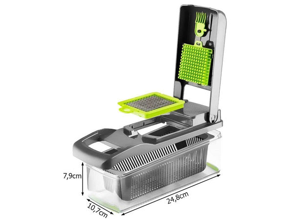 Daržovių pjaustyklė yra daugiafunkcinė vaisių ir daržovių pjaustyklė, kuri palengvina darbą virtuvėje. Jis puikiai supjaustys kubeliais, griežinėliais ir juostelėmis visus vaisius, daržoves, virtus kiaušinius ar sūrį ir susmulkins kopūstus salotoms. Naudodami tarkavimo mašiną galite be jokių problemų tarkuoti sūrį tiesiai į indą. Dėl laikymo rankenos nuo šiol nė vienas galiukas nenueis perniek. Pjaustyklė yra labai saugi dėl saugaus laikymo apsaugų, o visas dalis galima plauti indaplovėje. Visi pjaustyklės ašmenys pagaminti iš nerūdijančio plieno ir yra labai aštrūs. Dėl permatomo indo su dangteliu, paruošę visus ingredientus galėsite laikyti šaldytuve, ant stalo ar spintelėje, neprarasdami jų šviežumo. Rinkinyje yra krepšelis vaisiams ir daržovėms nusausinti. Labai naudinga, kai norite atsikratyti vandens pertekliaus. ✅ Dideli kauliukai: 12x12 mm ✅ Mažas kubelis: 6x6mm ✅ Dideli strypeliai: 4mm ✅ Mažieji stulpeliai: 2mm ✅ Skiltelės: 2mm ✅ Banguoti diskai ✅ Trintuvė (puikiai tinka kūdikių maistui) ✅ Produkto kodas: ✅ 07062 ✅ Medžiaga: plastikas, plienas ✅ Šeši skirtingi peiliukai ✅ Patogi rankena produktams laikyti ✅ Priedas, skirtas atskirti kiaušinių baltymus nuo trynių ✅ Plastikinis indas ✅ Patogi rankena ✅ Lengvai valomas ✅ Patogus daržovių skustuvas ✅ Tvirtas dizainas ✅ Supjaustykite daržoves, vaisius, kiaušinius, sūrį ir daugelį kitų maisto produktų kubeliais, juostelėmis, juostelėmis, griežinėliais. ✅ Neslystantis pagrindas ✅ Matmenys: 24,8 cm x 10,7 cm x 7,9 cm ✅ Spalva: žalia ir juoda ☑️ Gamyklinė nauja trintuvė vaisiams ir daržovėms tarkuoti ☑️ Skaidrus indas ☑️ Daržovių skustuvas ☑️ Produktų laikiklis ☑️ Šeši keičiami peiliukai ☑️ Šukos maisto likučiams nuo prietaiso sudedamųjų dalių pašalinti ☑️ Atskyrimo antgalis, skirtas atskirti kiaušinio baltymą nuo trynio ☑️ Originali pakuotė