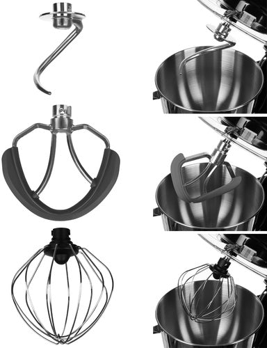 - 3 PATARIMAI – rinkinyje yra 3 patarimai ruošiant maistą. Maišytuvas su silikoninėmis guminėmis juostomis naudojamas puikiai sumaišyti tešlos ingredientus. Kablys buvo skirtas gerai minkyti tešlą, pvz. mielinę tešlą ir plaktuvą , kuriuo plakami lengvi ingredientai, pavyzdžiui, plakta grietinėlė arba kiaušinių baltymai.