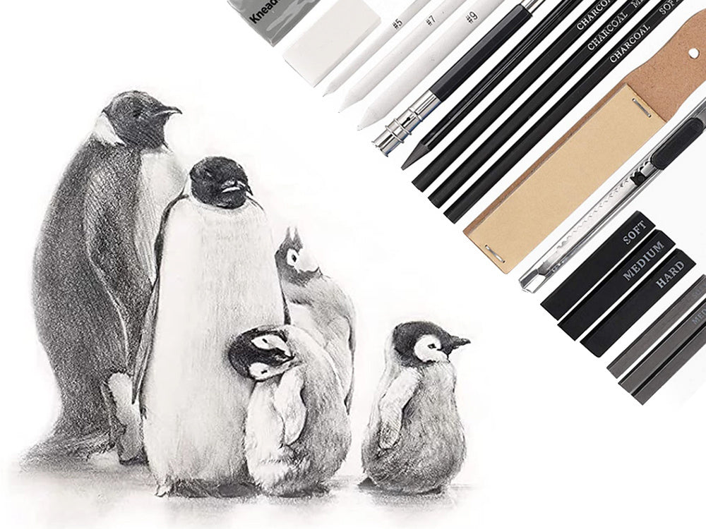 Rinkinys pristatomas patogioje užtrauktuko dėklėje, leidžiančioje lengvai transportuoti ir laikyti visus reikmenis. Trintukas iš nevulkanizuotos gumos puikiai tinka grafito pašalinimui, o dvipusis galąstuvas užtikrina, kad kiekvienas pieštukas būtų paruoštas piešimui.