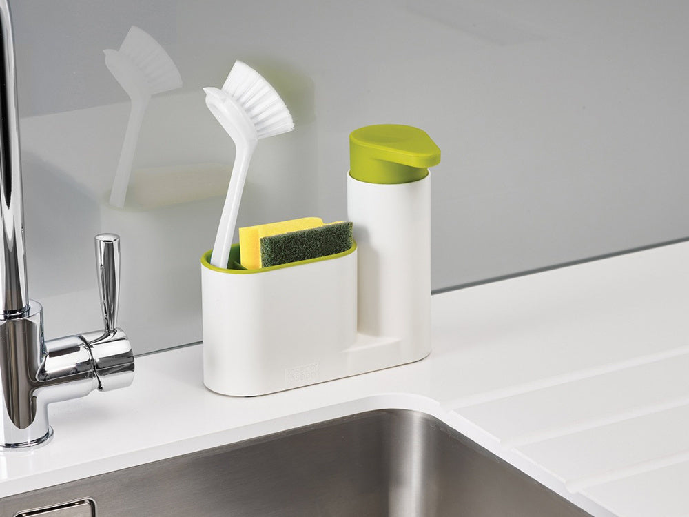 - Daugiapakopis dizainas: Jame yra du skyriai, skirti muilui ir indų plovimo įrankiams, tokiems kaip šepetėliai ar kempinės.